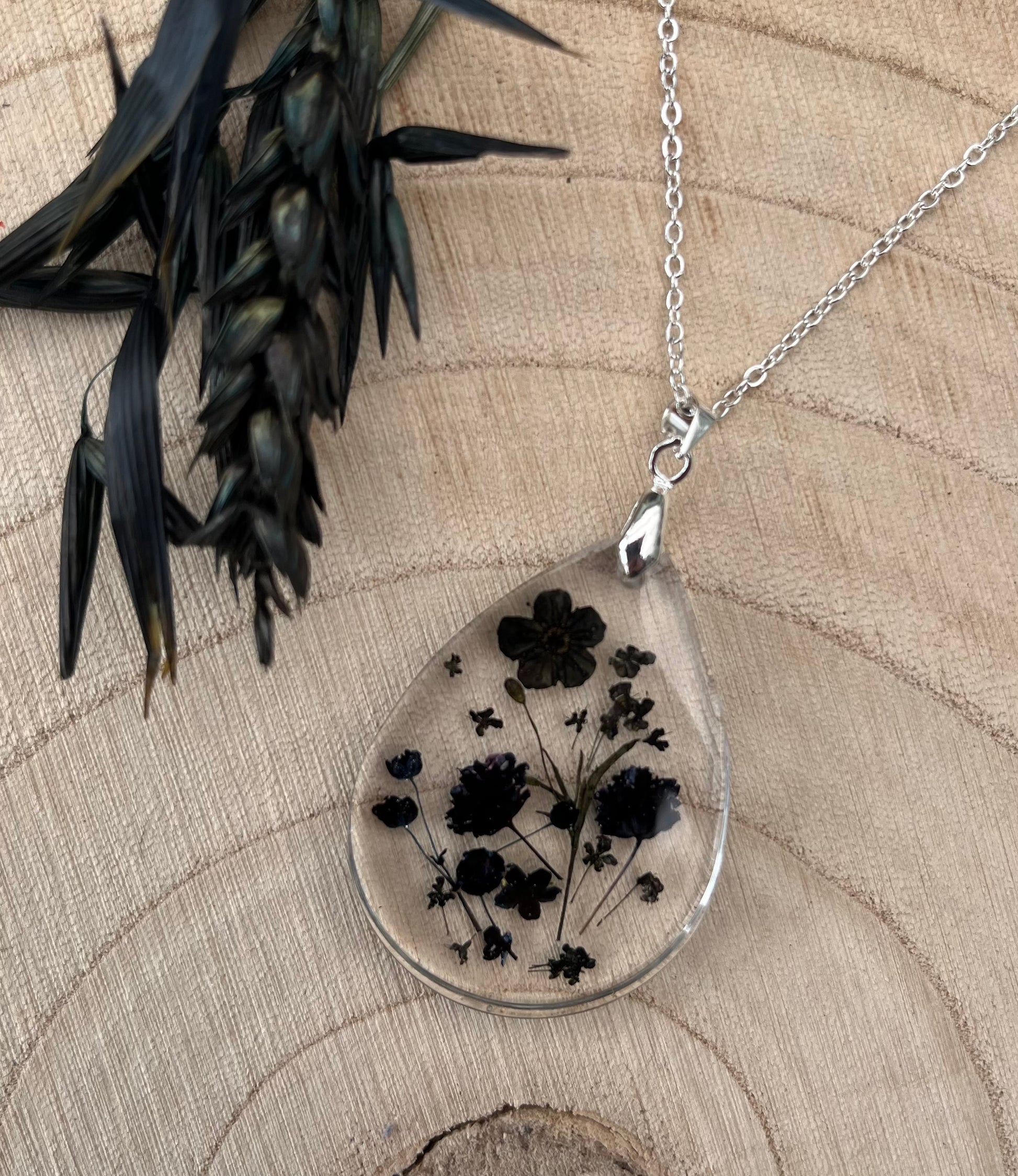 This teardrop is filled with lots of black pressed flowers and encased in resin.
