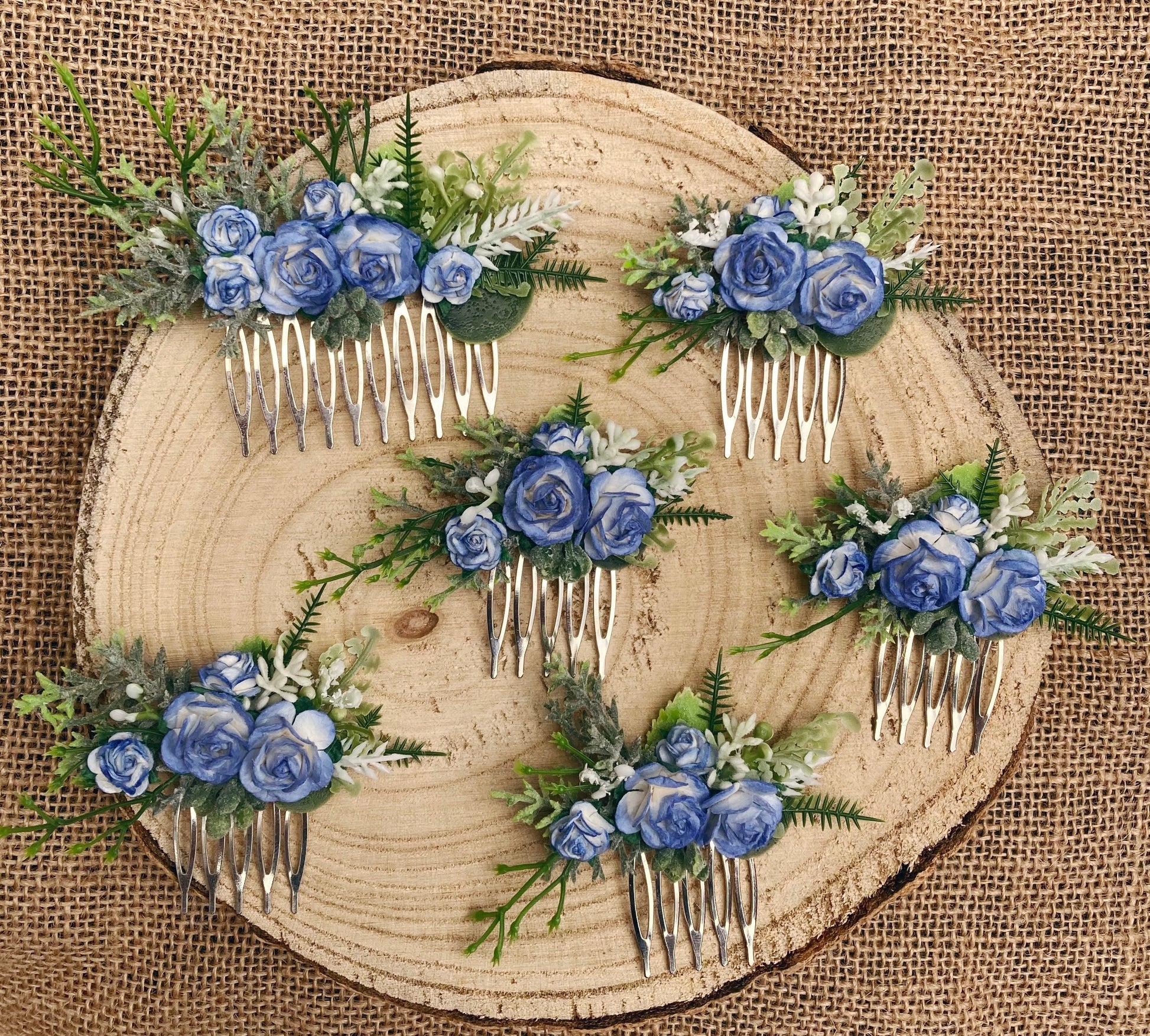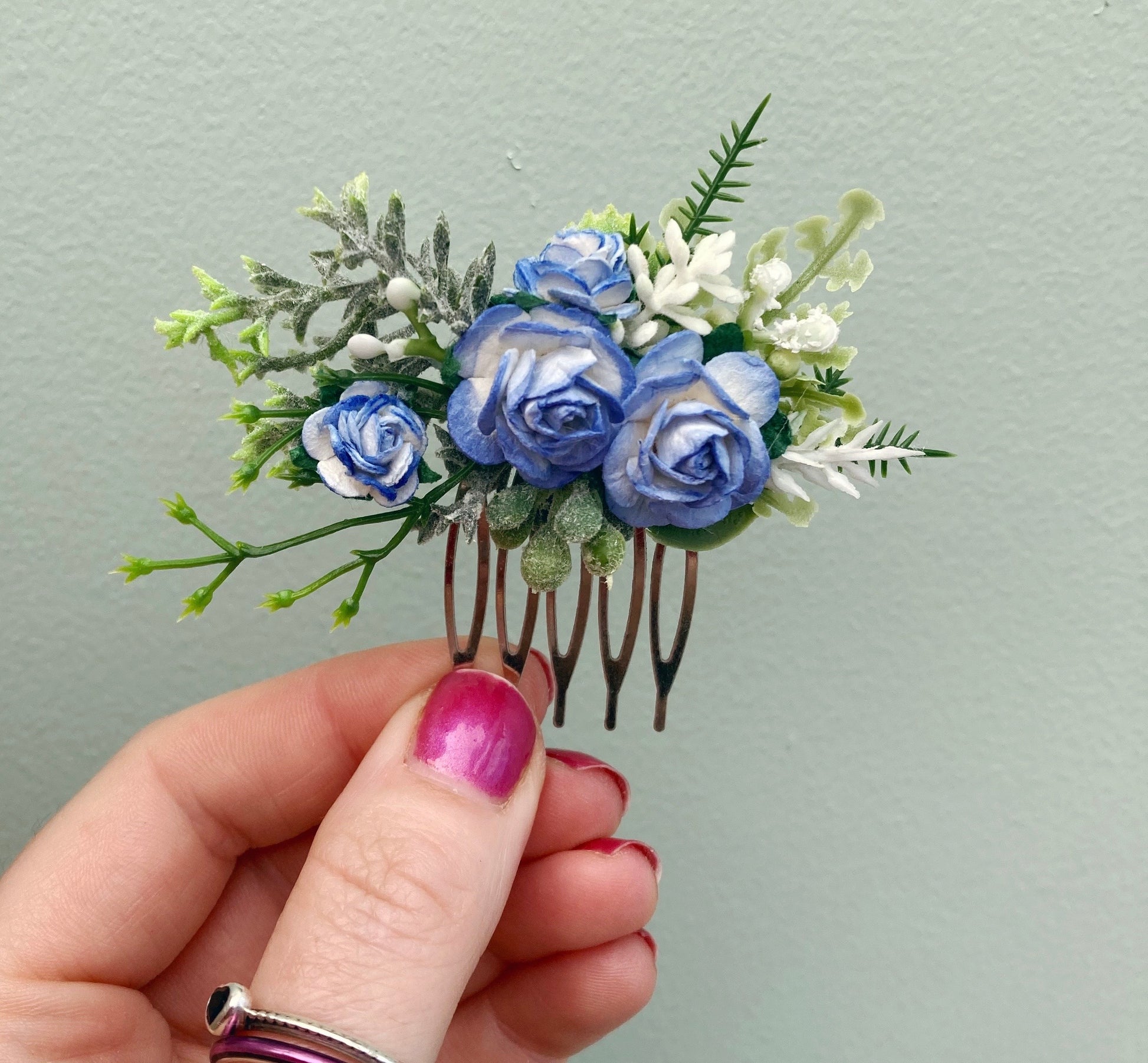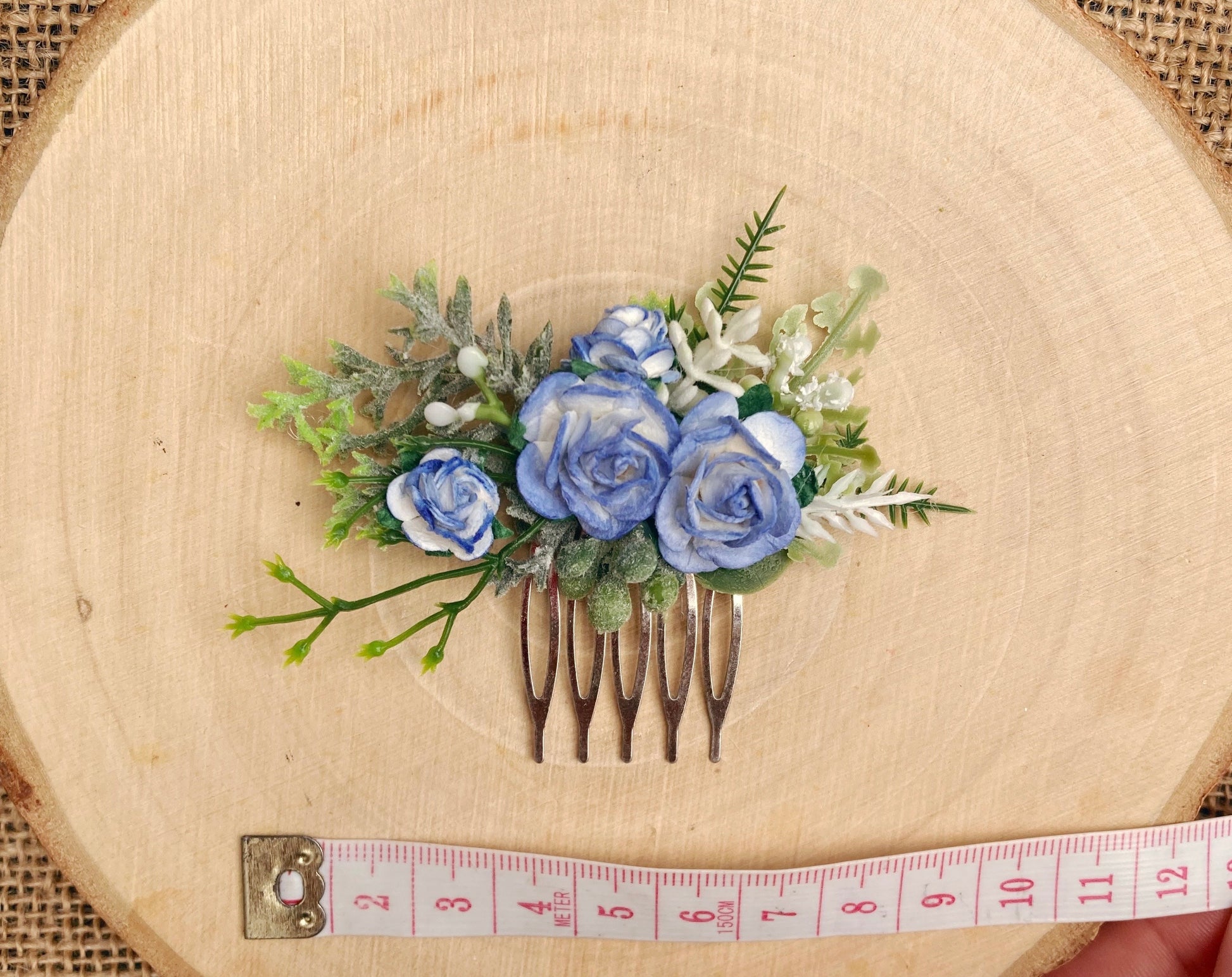 Adorned with blue and white mulberry paper roses, white lavender and quality faux foliage set on a silver comb.