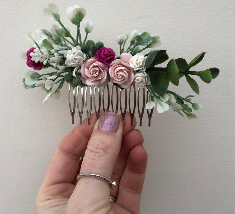 Adorned with blush pink and bright pink/fuchsia with white mulberry paper roses and quality faux foliage set on a silver metal comb.