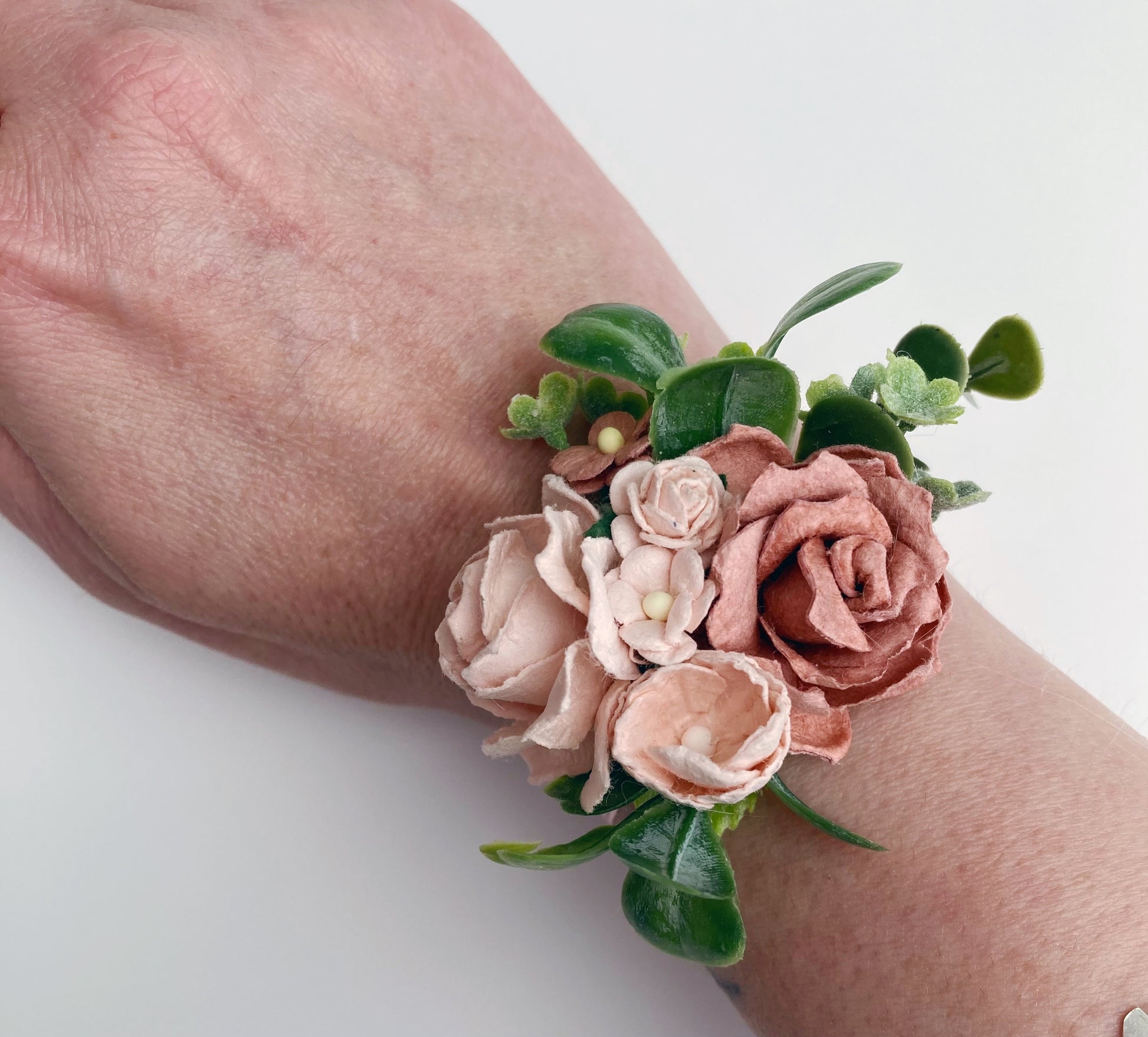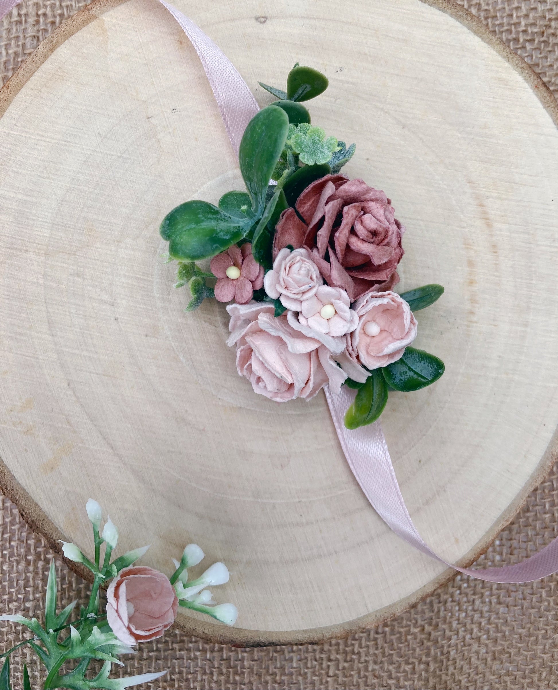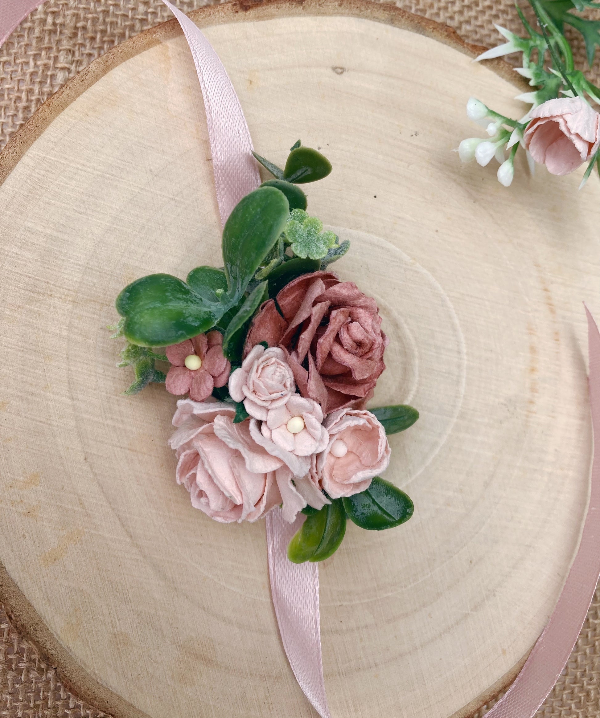 Featuring a small 3cm dusky pink paper rose, with smaller 1cm and 2cm flowers in blush and dusky pink. With faux foliage added to finish it off. Finished off with a blush pink ribbon to tie around the wrist.