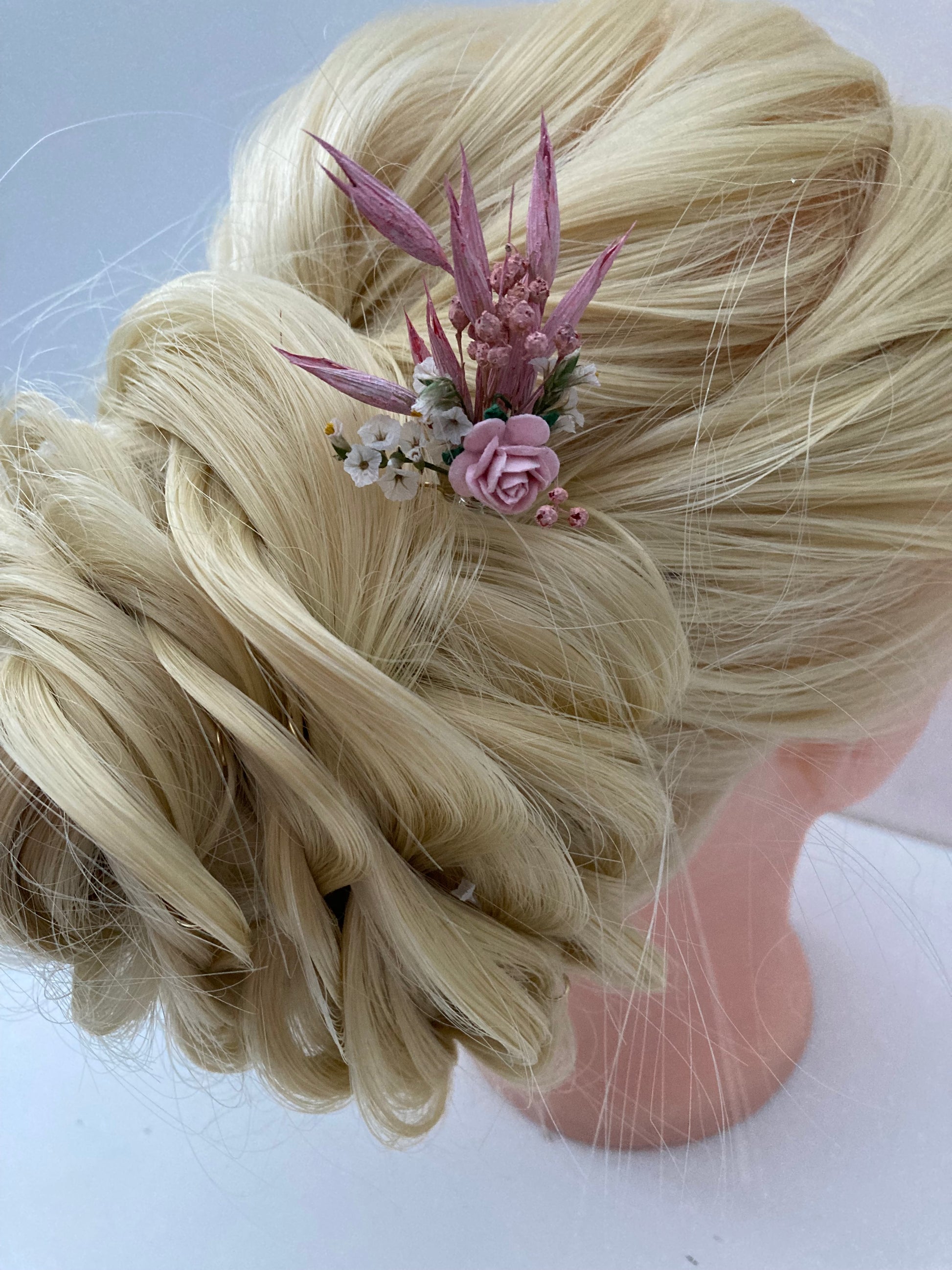 These little pins are handmade using pink oats, pink broom bloom, white limonium and pink paper flowers, all attached with silver wire to a long silver hair pin.