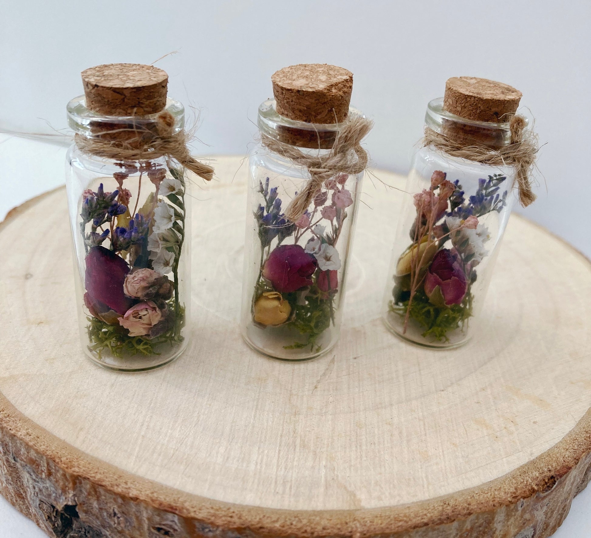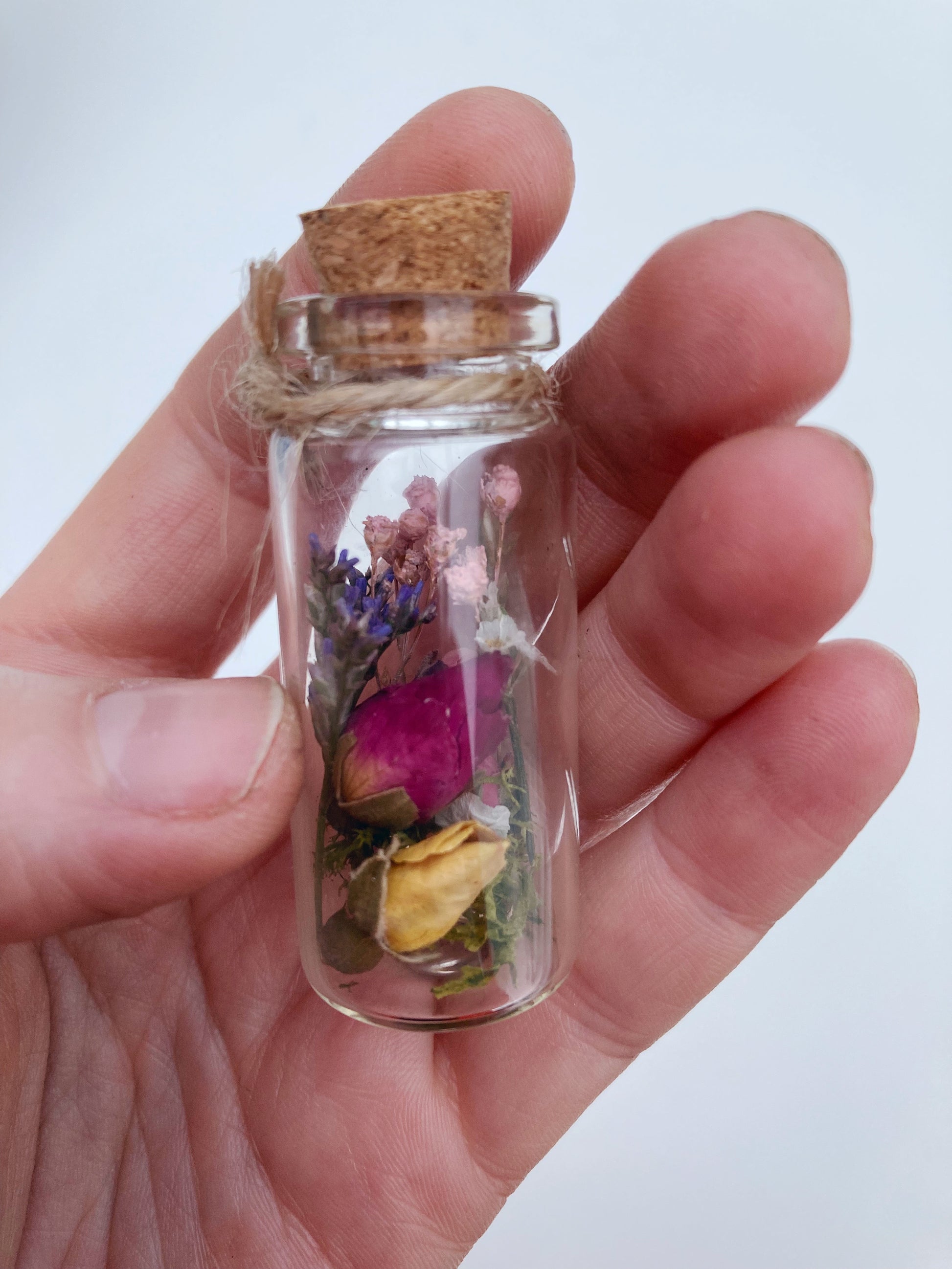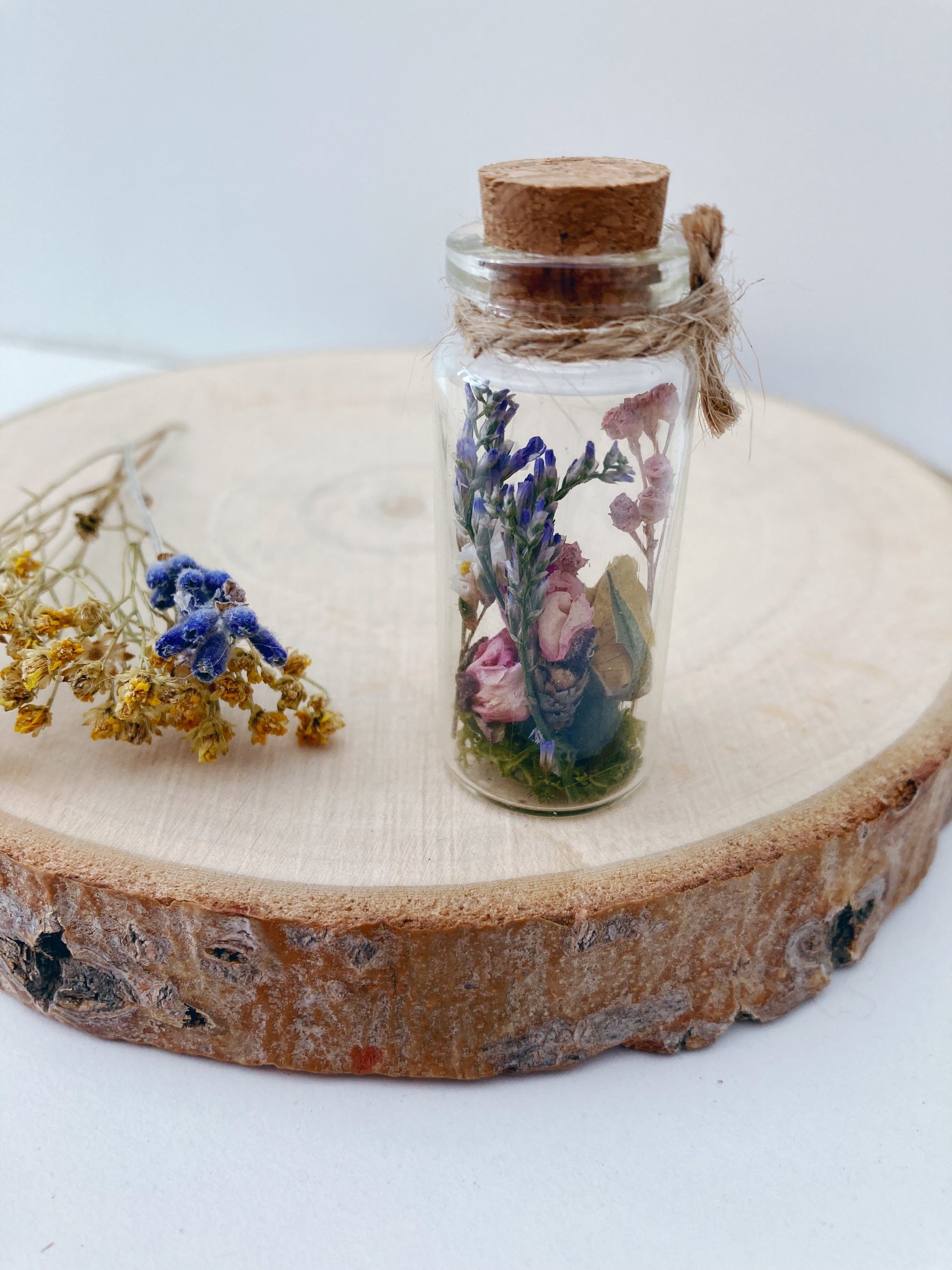 A sweet little glass jar full of dried flowers. Tied with hessian string and a tag saying Happy Mothers Day.
