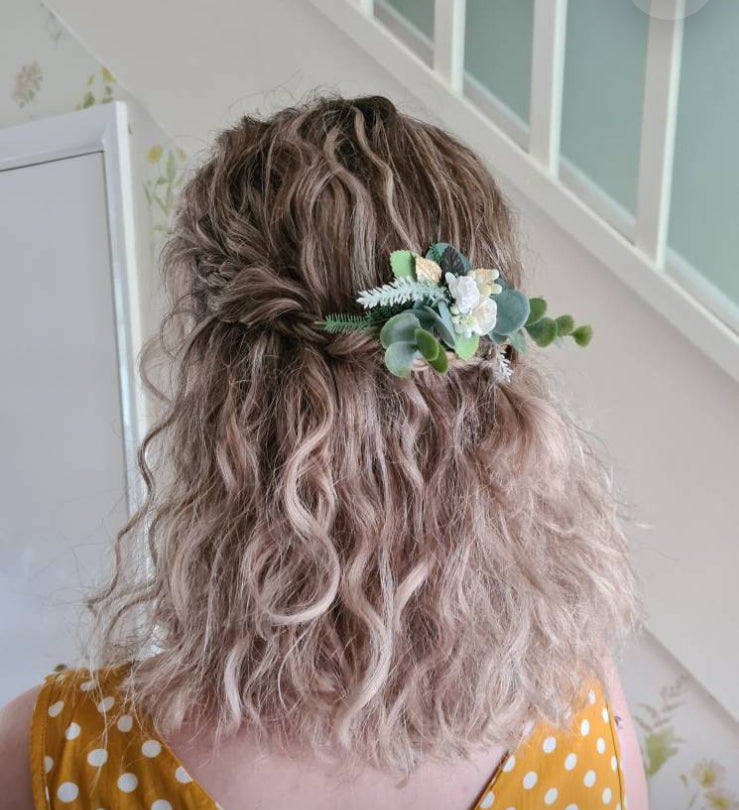 Adorned with small ivory mulberry paper roses, eucalyptus, sprigs of white lavender, gold leaves and quality faux foliage set on a silver metal comb.