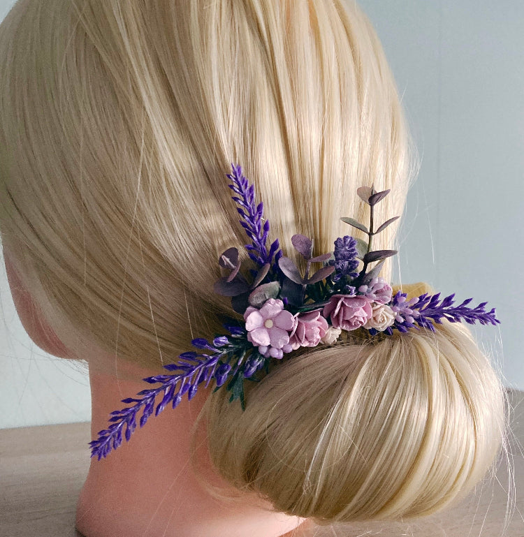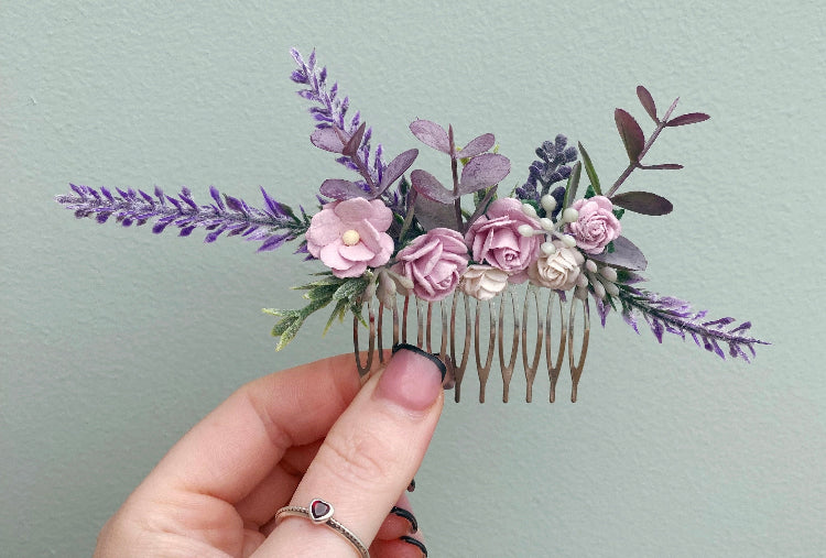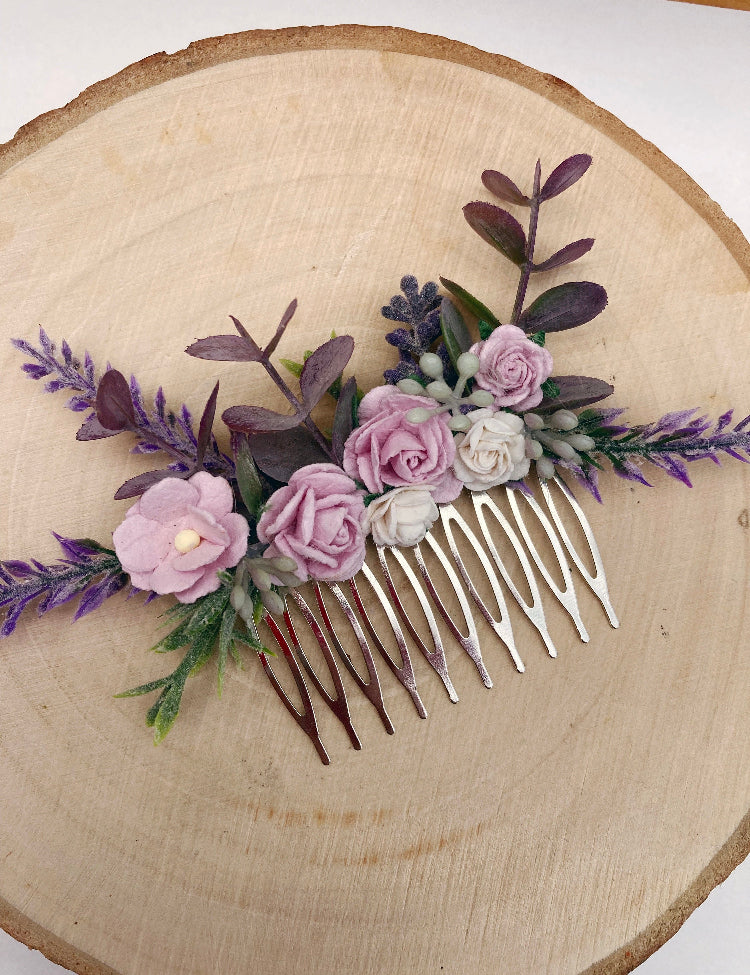 Adorned with lilac and white mulberry paper roses, faux lavender and quality faux foliage set on a silver metal comb.