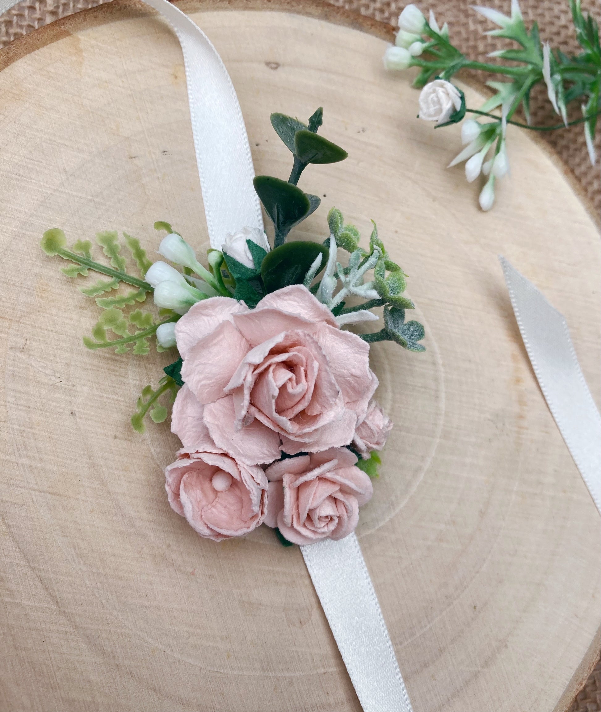 Featuring a small 3cm blush pink paper rose, with smaller 1cm and 2cm flowers. With faux foliage added to finish it off. Finished off with an ivory or blush pink ribbon to tie around the wrist.