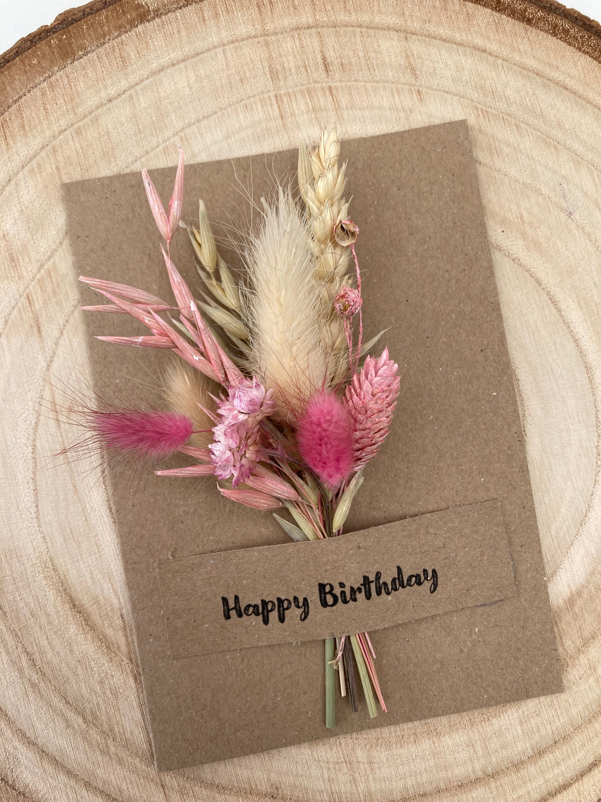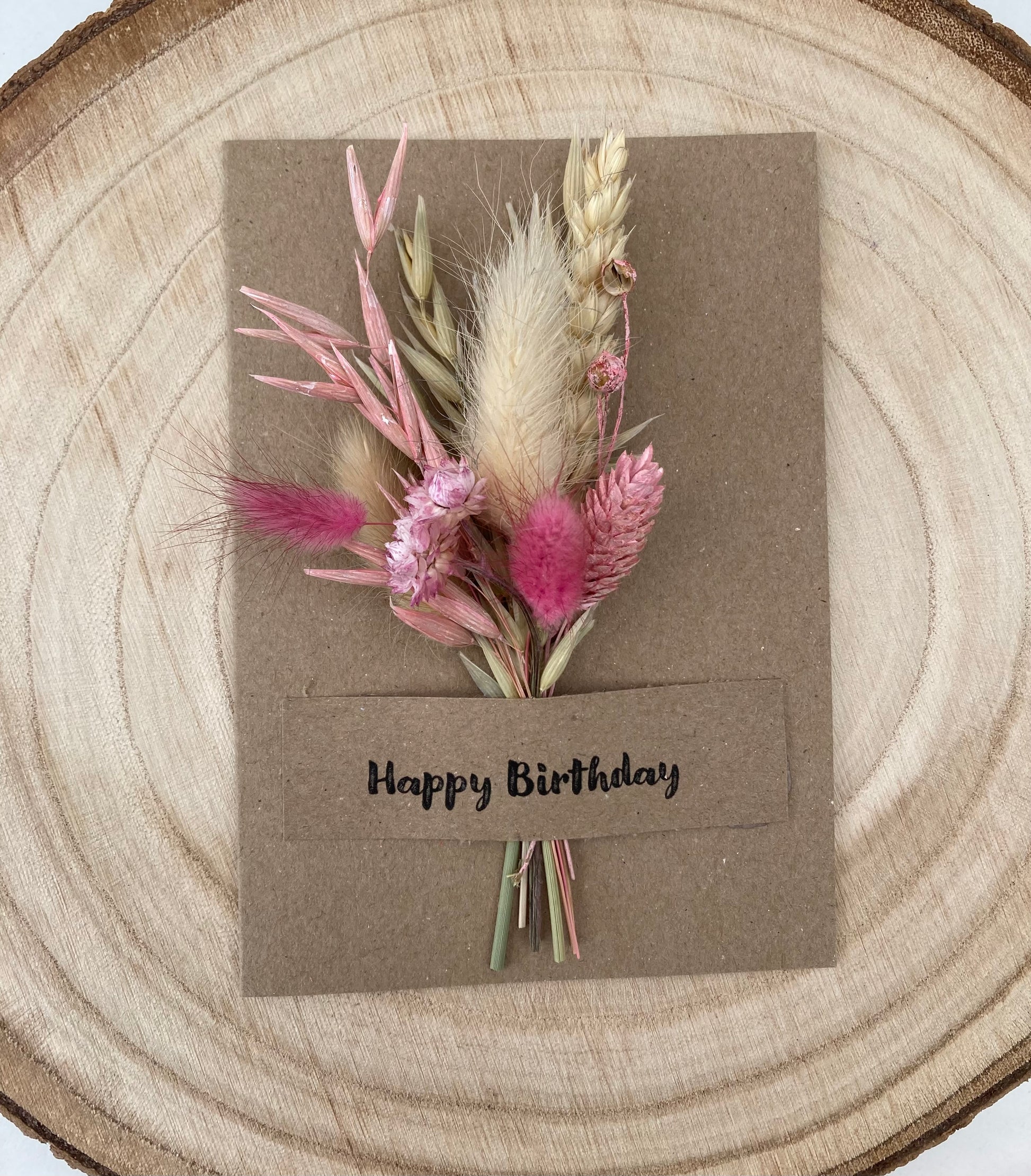 Featuring a small posy of nature and pink dried flowers to keep after they have finished displaying the card. A wonderful keepsake to treasure. Choose between Happy Birthday or Especially for you, to be displayed on the card .