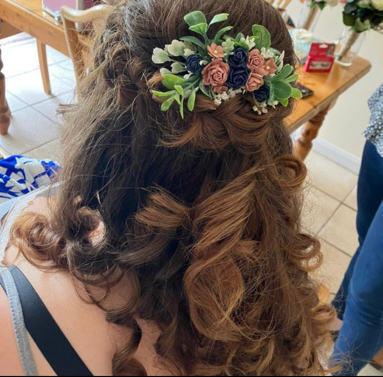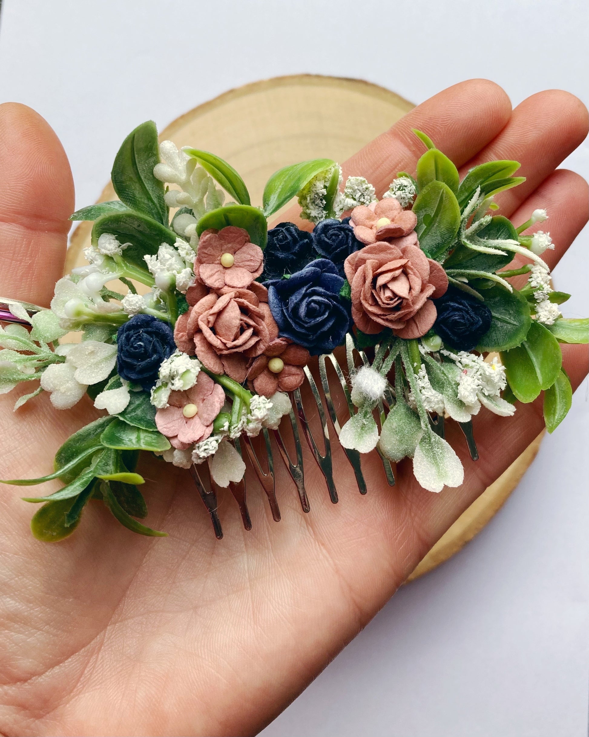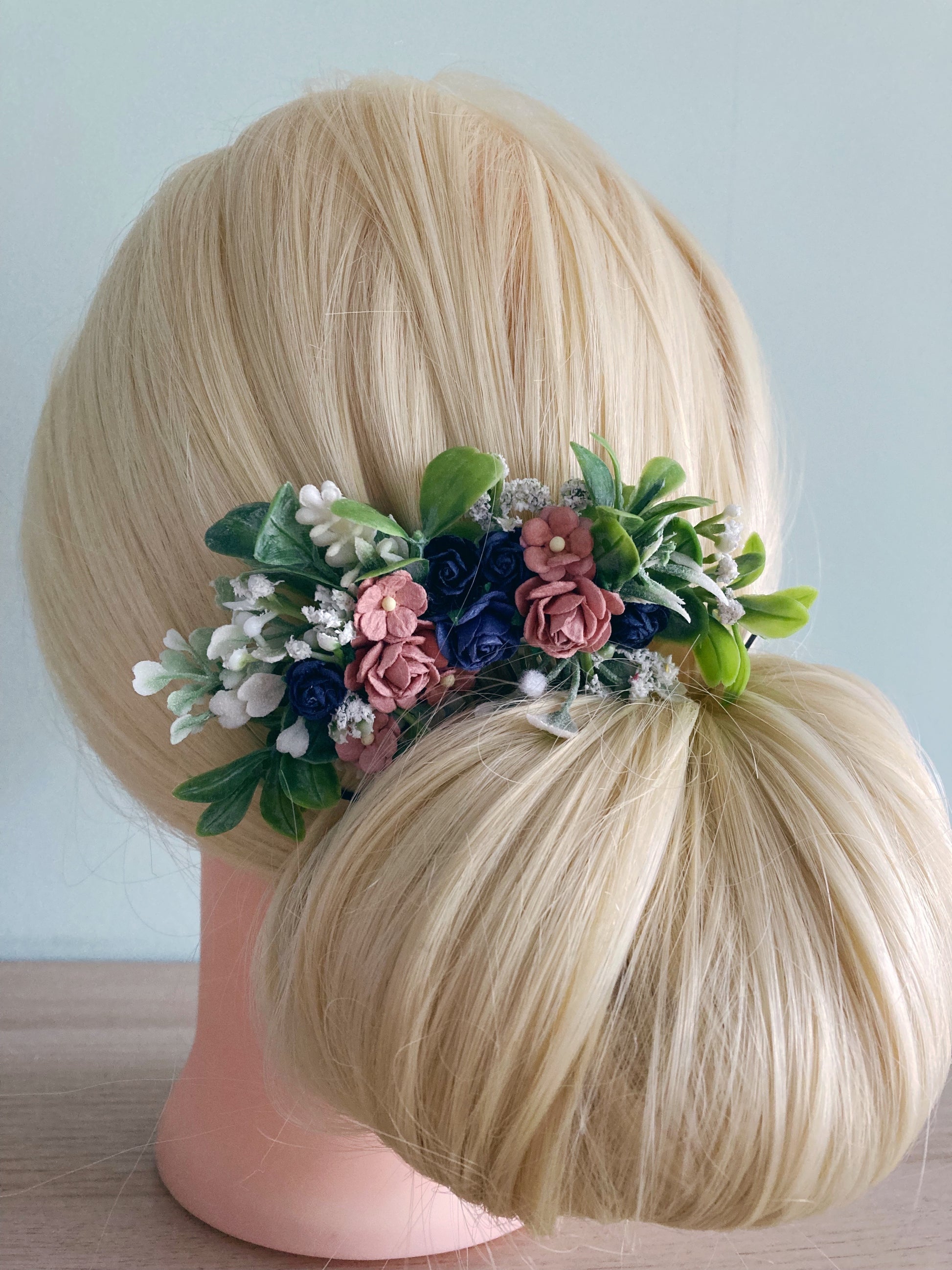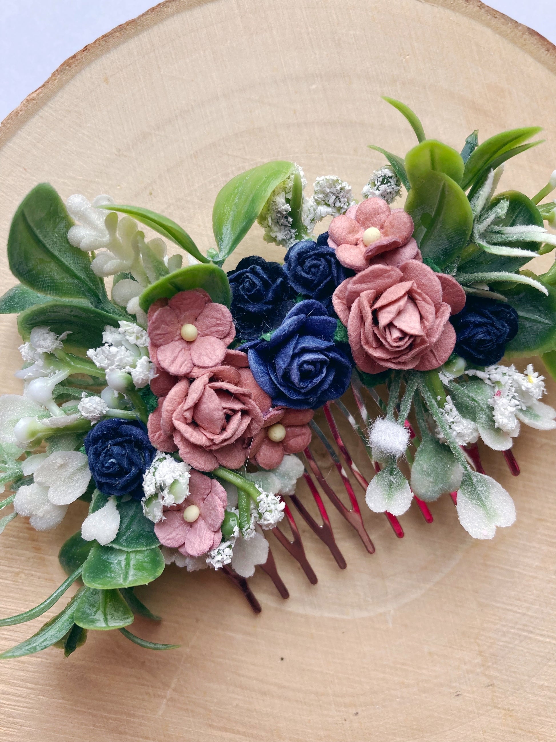 Adorned with blush pink and navy mulberry paper flowers and quality faux foliage set on a silver metal comb.