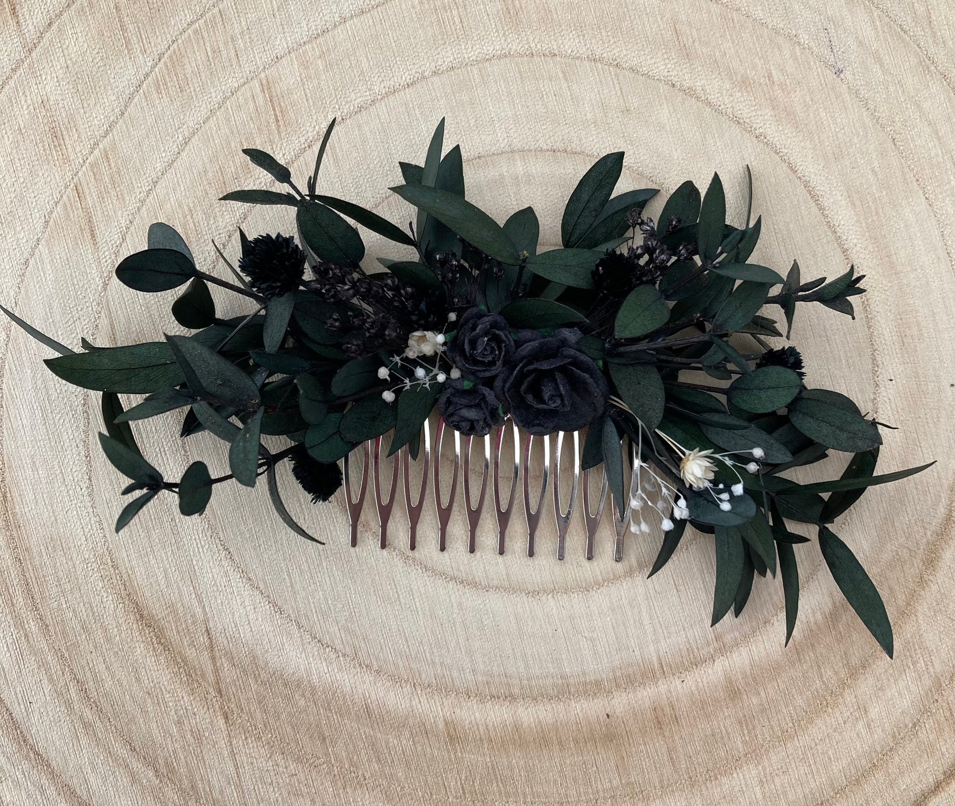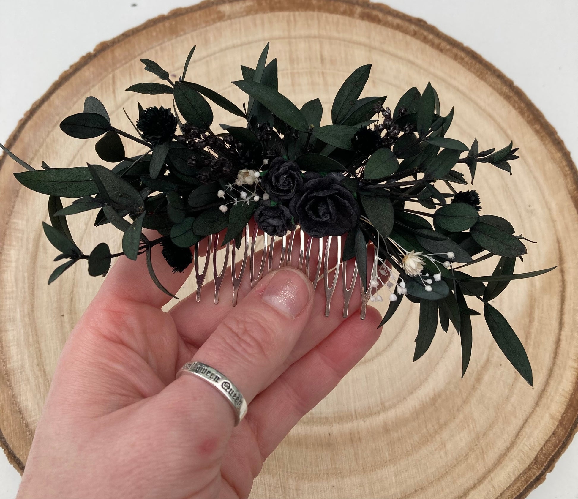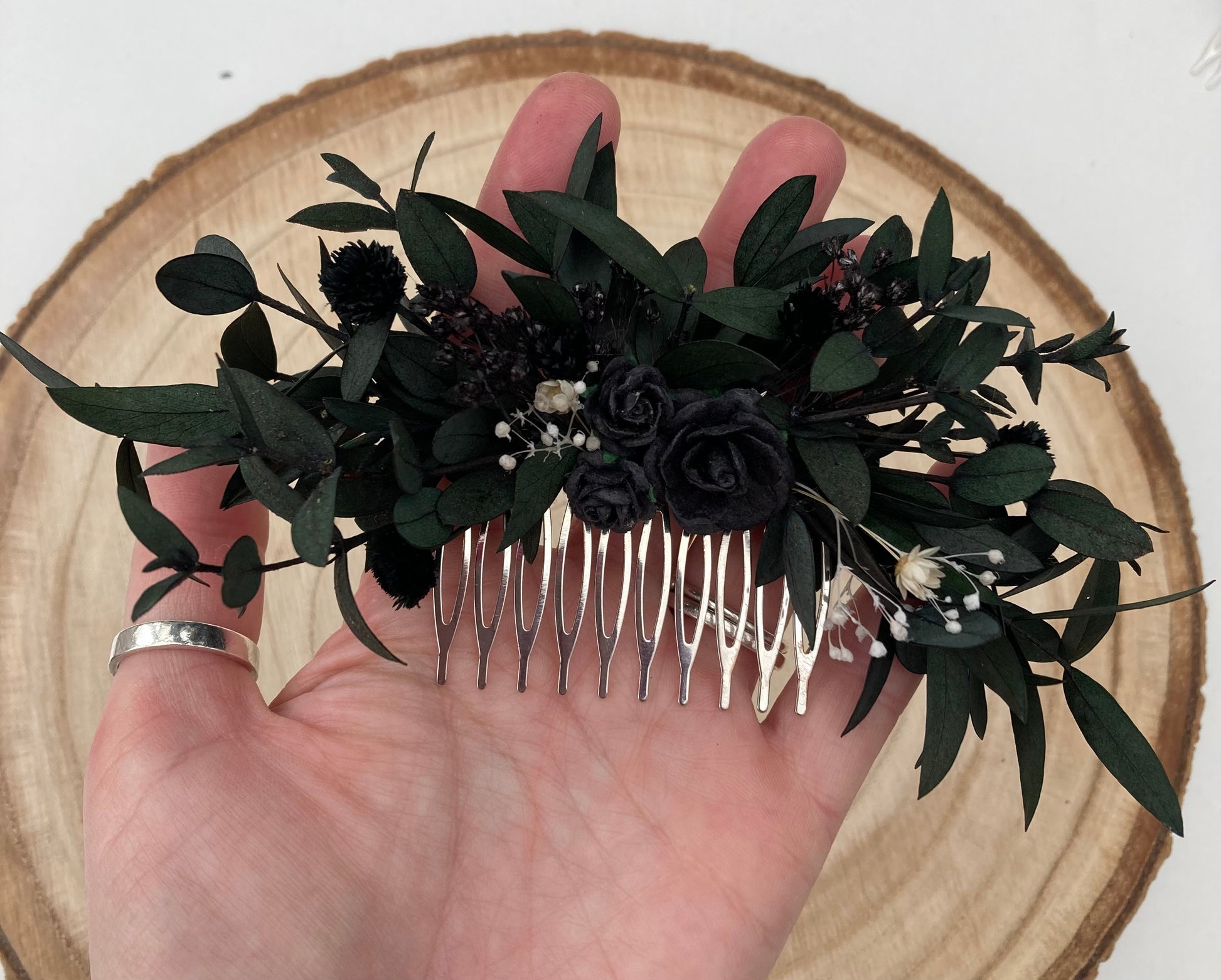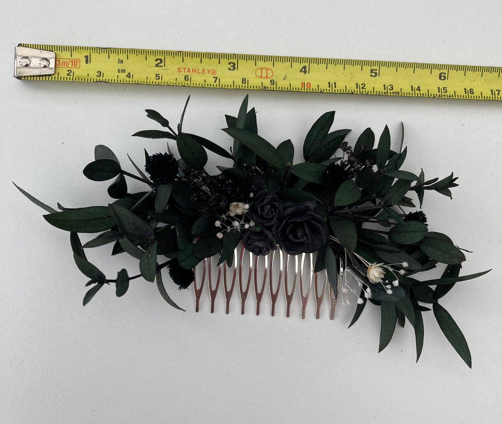 This beautiful flower hair comb, complete with black flowers and eucalyptus is the perfect finishing touch for any bride, bridesmaids or flower girls wedding hair.