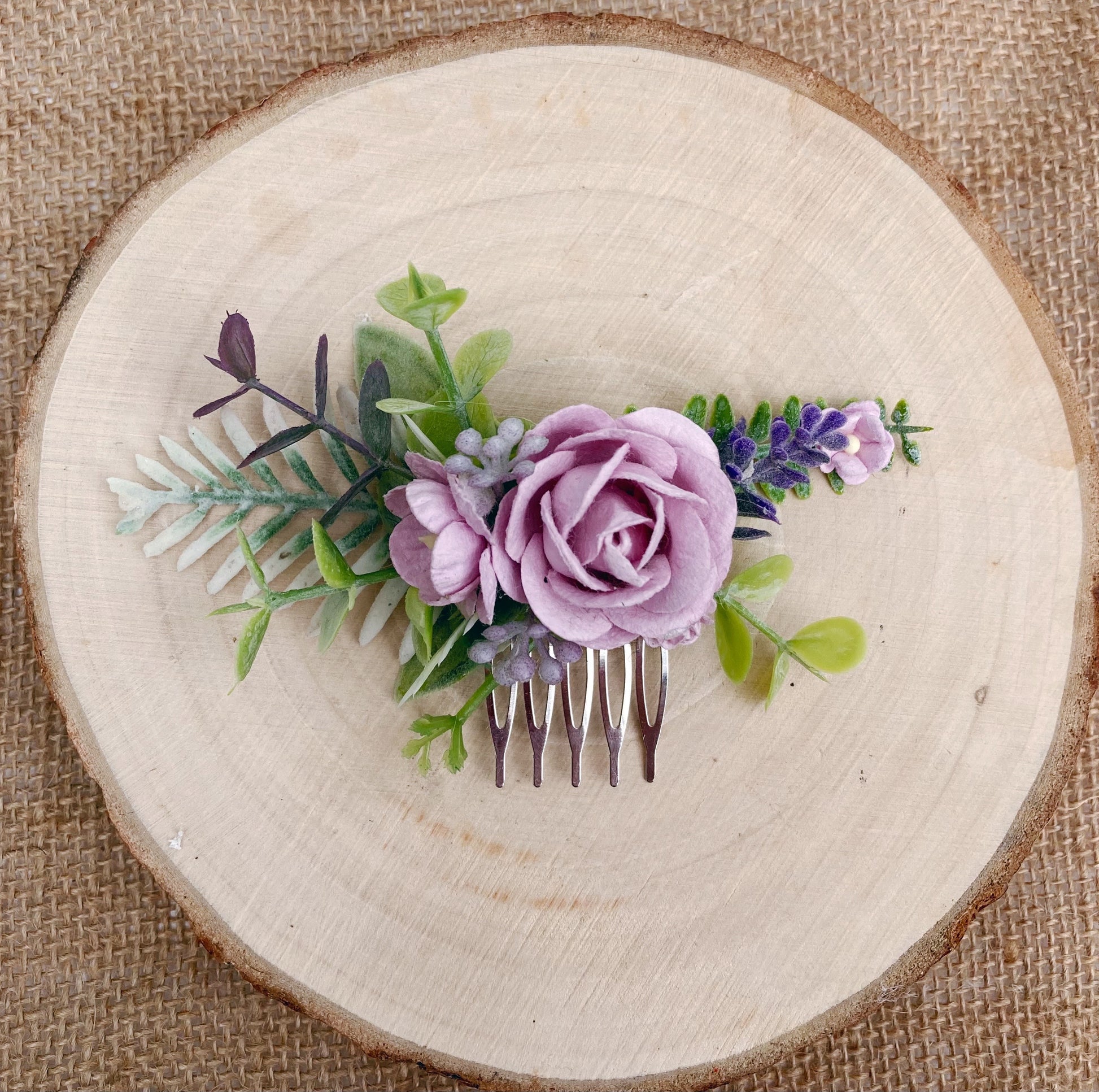 Adorned with lilac mulberry paper roses, faux lavand quality faux foliage set on a silver metal comb.