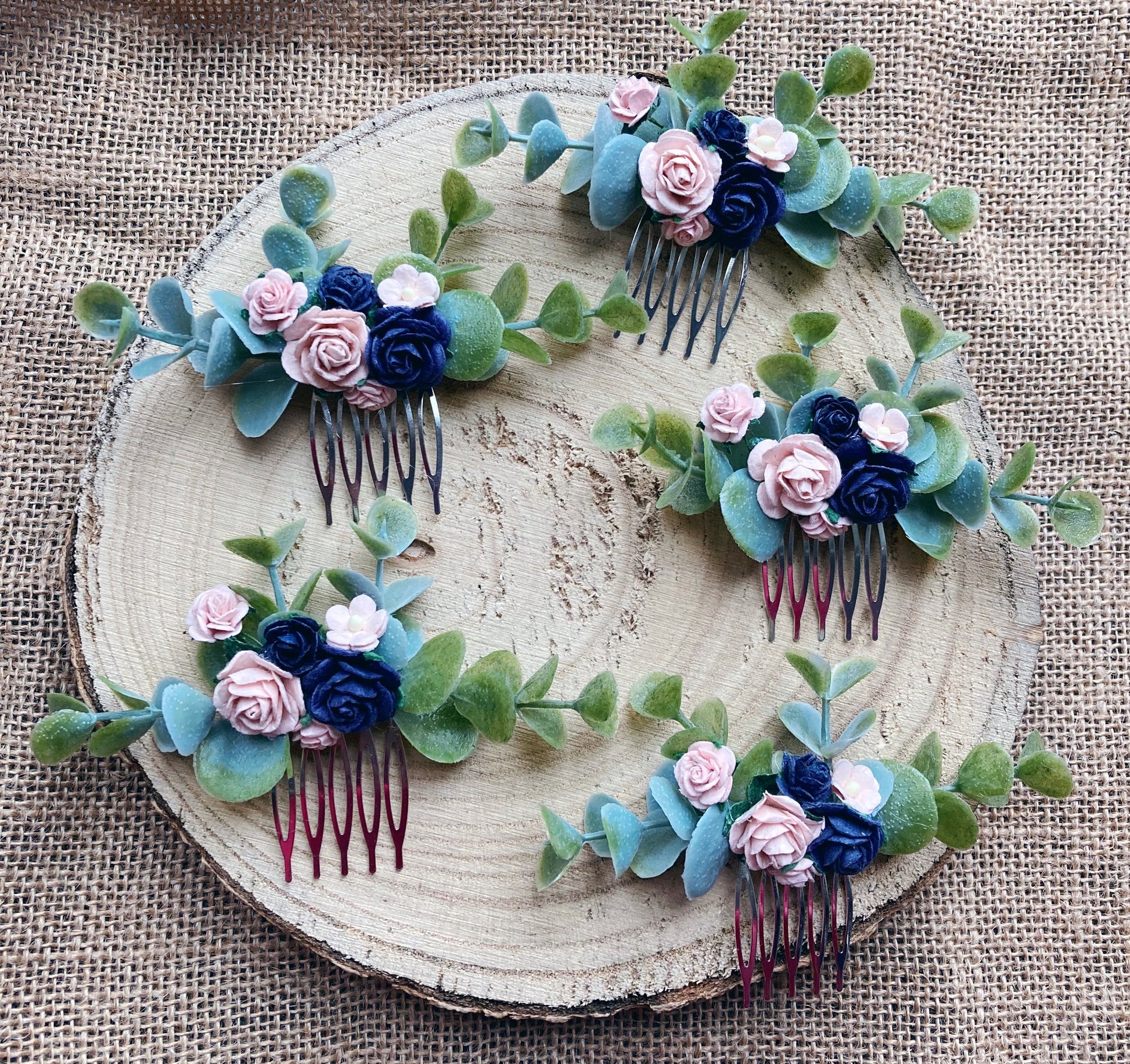 Adorned with navy and blush mulberry paper roses and quality faux eucalyptus set on a silver metal comb.