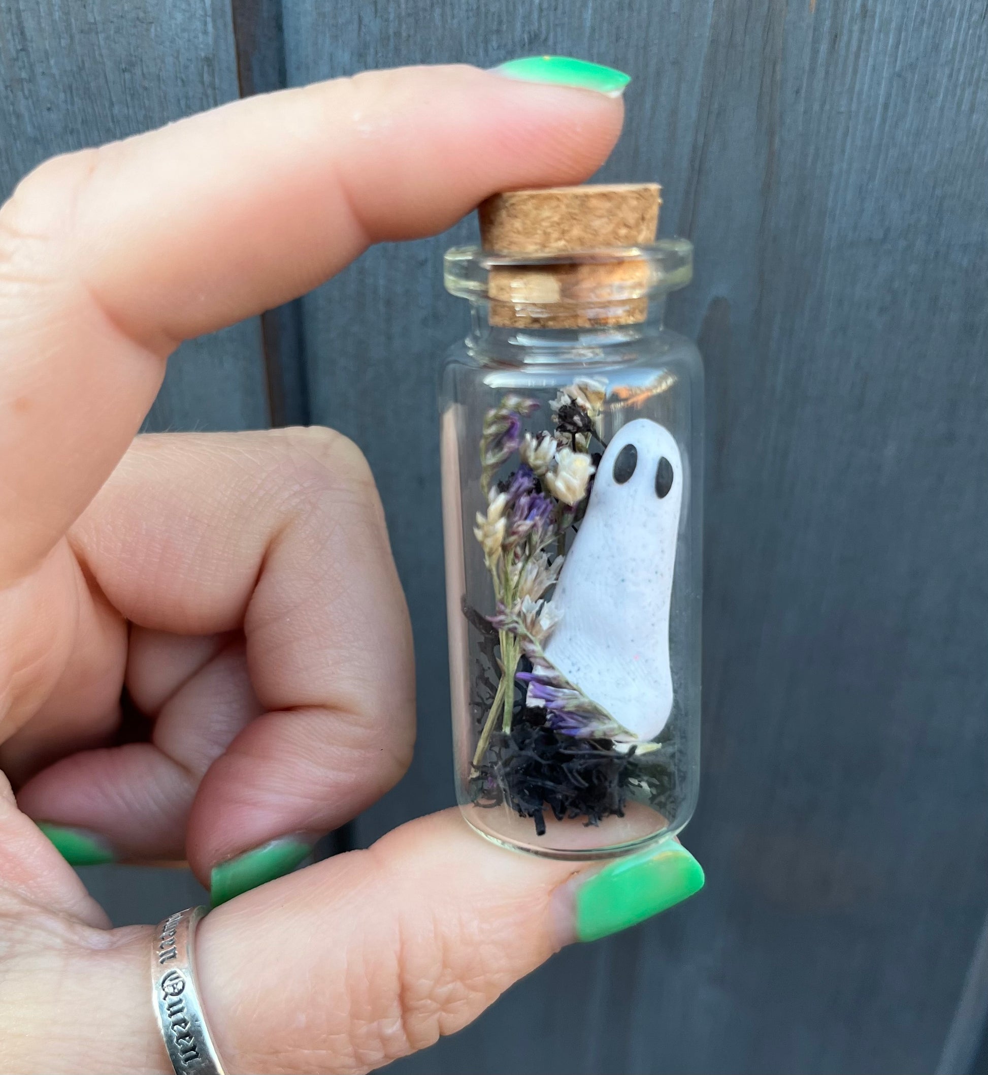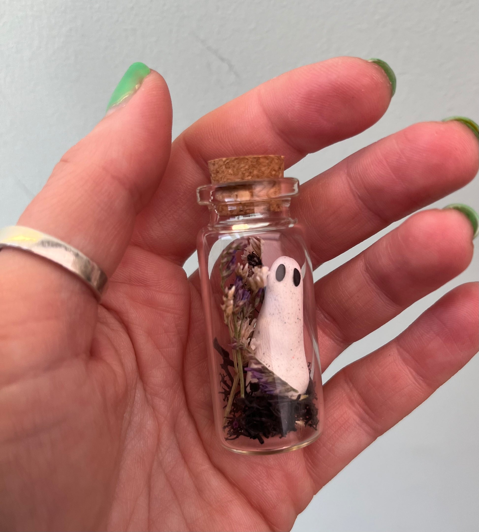 A tiny glass jar filled with dried flowers and your very own pet ghost made of clay.