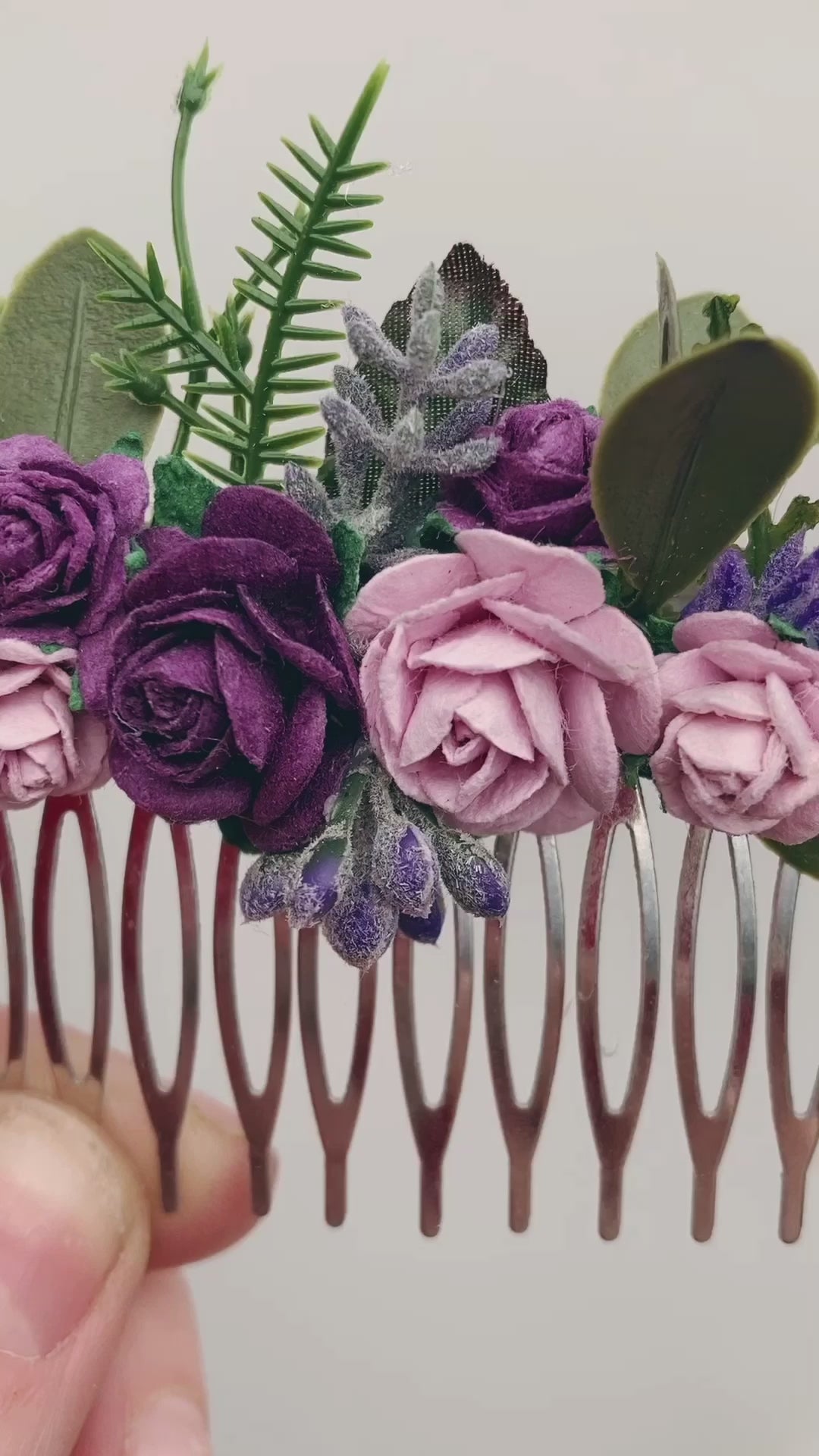 Adorned with lilac and purple mulberry paper flowers, faux lavender and quality faux foliage set on a silver metal comb.