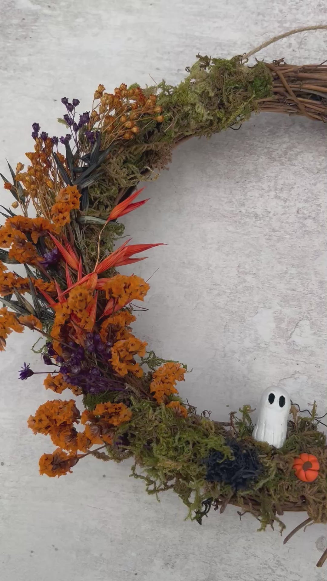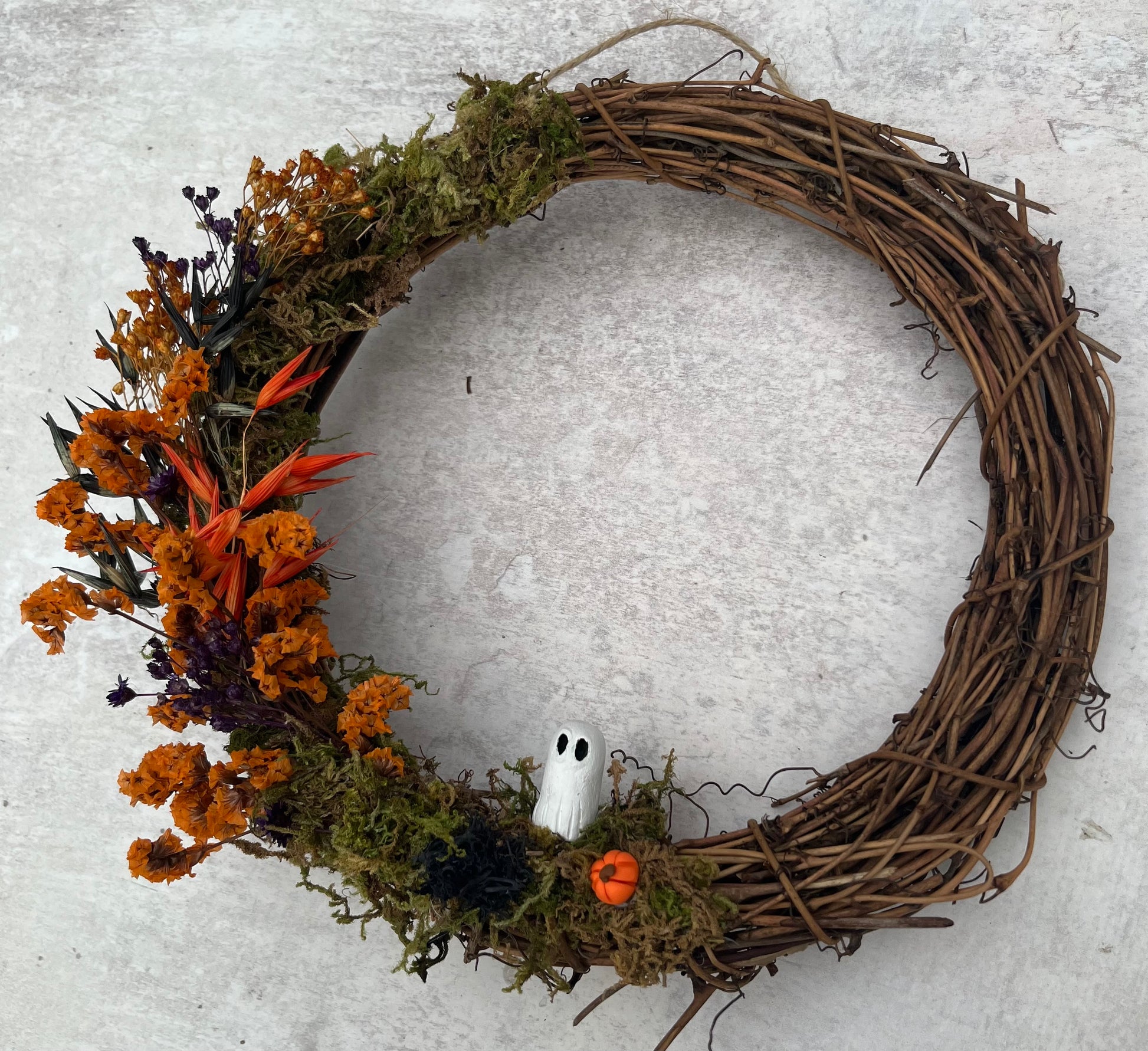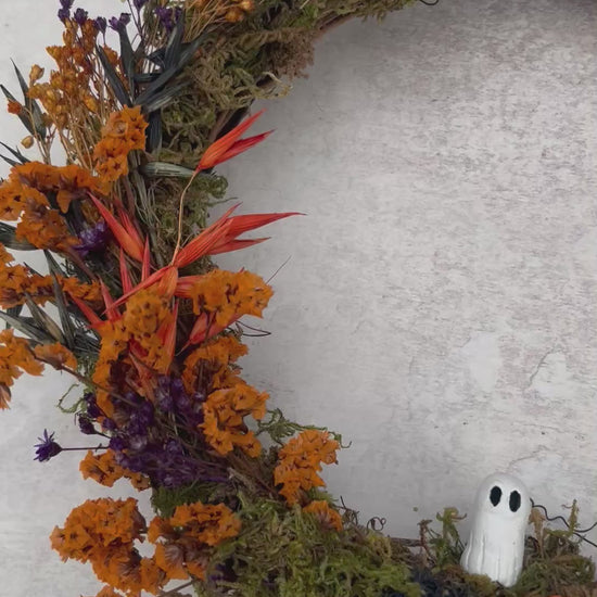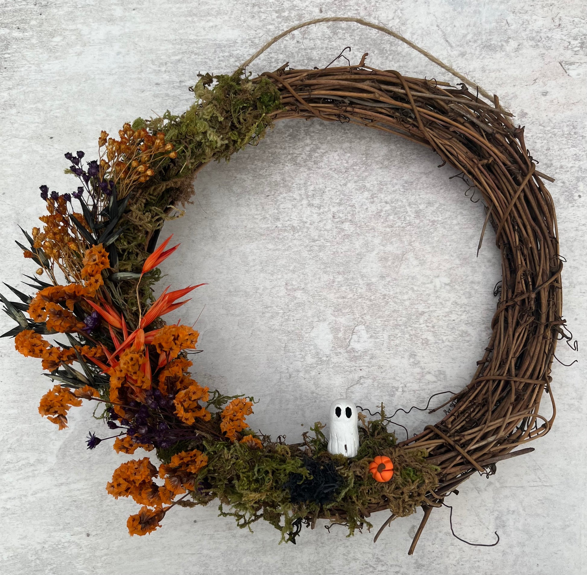 Bring a touch of spooky charm to your home this Halloween with our handcrafted dried flower wreath. Made with a blend of natural dried flowers and moss, this unique wreath is finished with a miniature ghost and pumpkin handmade from clay.